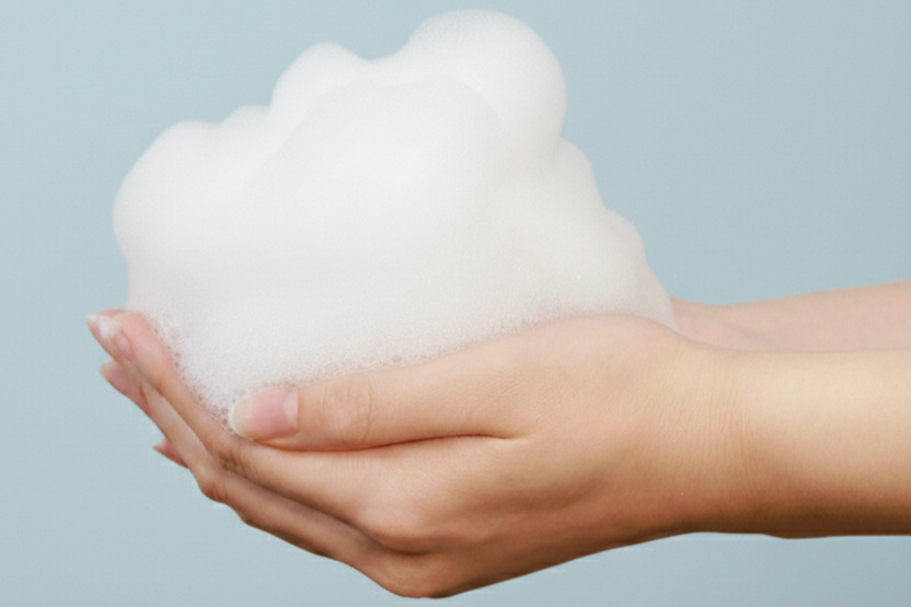 泡立てネットなどでしっかり泡立て、肌の上で転がすようにやさしく洗うのがコツ。