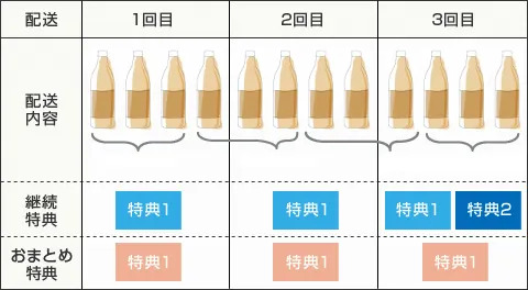 1.《継続特典》は1~2回目の配送で《特典1》が付き、3回目の配送では《特典1》と《特典2》が付きます。